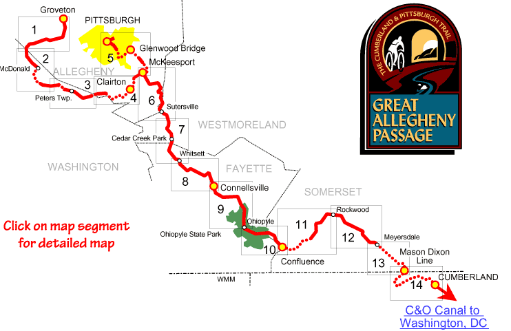 | This page is part of the Allegheny Trail Alliance's site in support of the Great Allegheny Passage, a motor-free recreational rail trail connecting Pittsburgh PA and Cumberland MD. Copyright © 1998, 1999, 2000, 2001by Allegheny Trail Alliance, Bill Metzger, Mary Shaw, and Roy Weil. Amenity information courtesy of FreeWheeling Easy. We encourage you to create links to this site and to print copies of the maps for your personal use. We prohibit other uses of this site, especially if they generate spam or other mass communications -- see our Privacy Policy.. This page was last modified on 07/12/01. Send email to ATA or contact the ATA or member trails. | ||||||